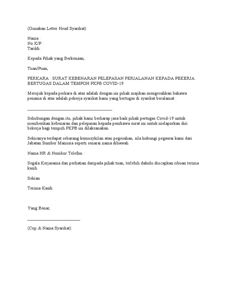 Template Surat Pelepasan Hadir Bekerja Dalam Tempoh Pkpb Kongsikan Kepada Rakan